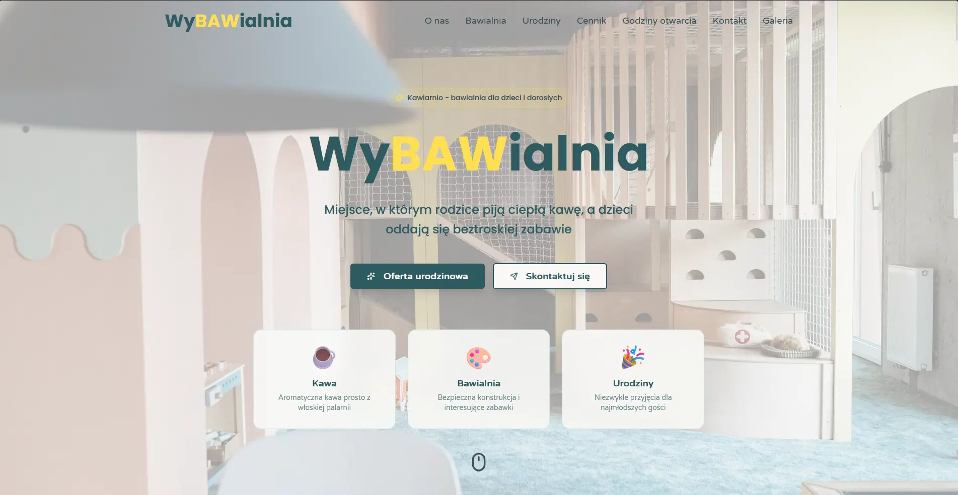 Strona zrealizowana dla bawialnio - kawiarni WyBawialnia, oferującej organizację urodzin dla dzieci. Zrealizowana przy użyciu SvelteKit, Tailwind CSS i TypeScript. Postawiona na Vercel. Zoptymalizowana pod SEO.